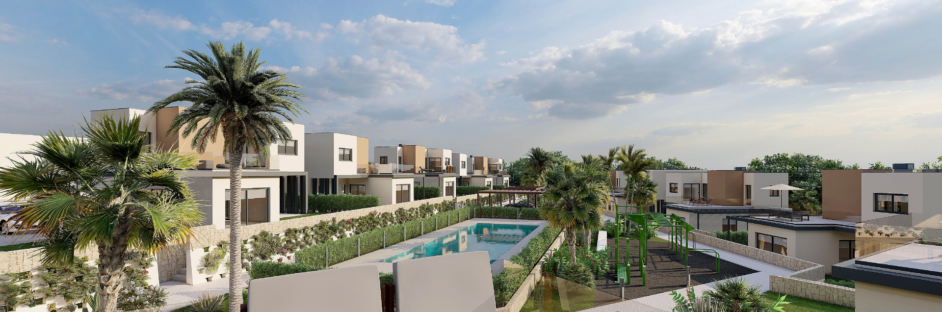 Our new development of two-storey detached villas with terrace, garage, garden, and porch area with pergola, located in the heart of the Corvera Golf & Country club. They also use aerothermics, the latest in energy efficiency. The residential complex has swimming pools, chill-out area and communal parking. It is 25 minutes from Murcia and 8 minutes by car from the city of Corvera, with all the city’s services such as shops, restaurants, schools & gyms. Prices between €341.000 – €355.000.
