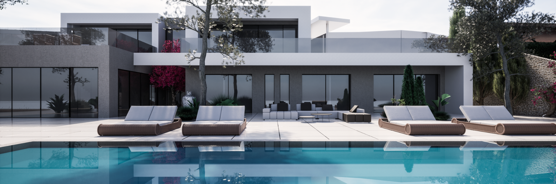 Ground floor will host large living room area and dining space, open kitchen with pantry, WC for guests and a large double height atrium. Moreover ground floor will include two bedrooms with en-suite bathroom and a walk-in closet. Living room and dining space will open to a large exterior space partially covered with pergola in front of a big swimming pool.