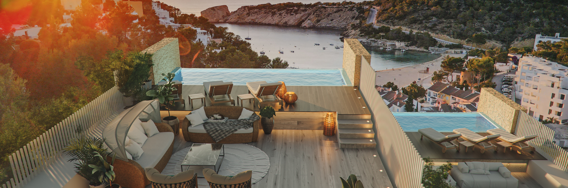 New residential complex just 100 meters from the sea in Cala Vadella, one of the most beautiful and prestigious areas of Ibiza, with 12 luxury apartments priced between €850.000 – €1.300.000. There are 3 types: penthouses with private solarium, duplex apartments, and first floor apartments, each with a private swimming pool and 2 parking spaces. The houses are surrounded by wooden platforms that maintain the idea of connection with nature and create an environment inspired by tranquillity and peace.