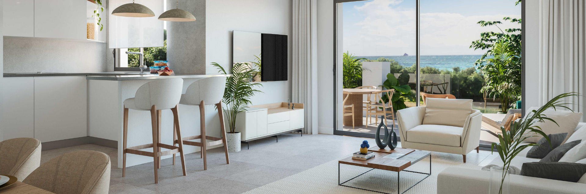 Panorama, a new residential complex in the Island of Fuerteventura, Corralejo, comprises 64 apartments with 2 and 3 bedrooms, spacious living rooms, open plan kitchens, and panoramic sea views, located near Corralejo beach.