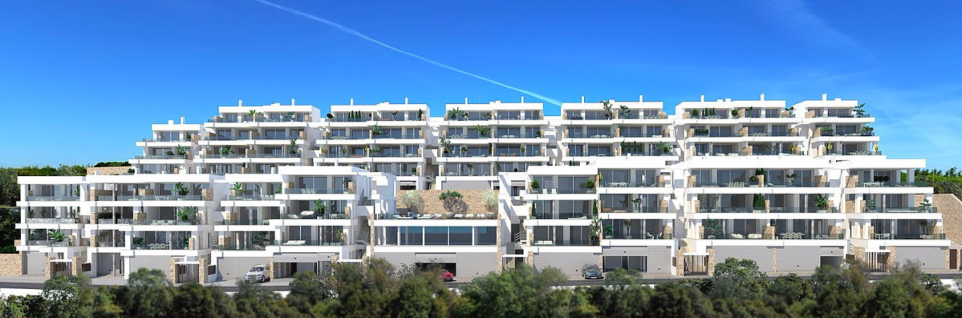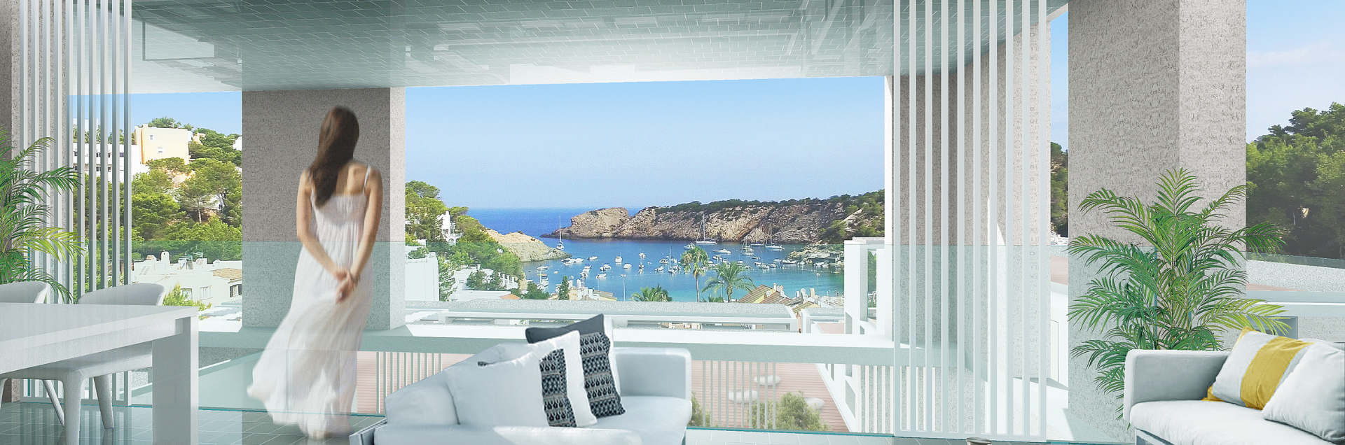Impressive project of 64 units priced between €300.000 – €1.500.000. Located in Cala Vadella, Ibiza, Balearic Islands. All units have views of the sea and the valley of Sa Talaia. Penthouses with solarium, where you can enjoy one of the most beautiful sunsets on the island. The building is characterised by the presence of hand-cut Ibizan stone and minimalist glass balconies.
